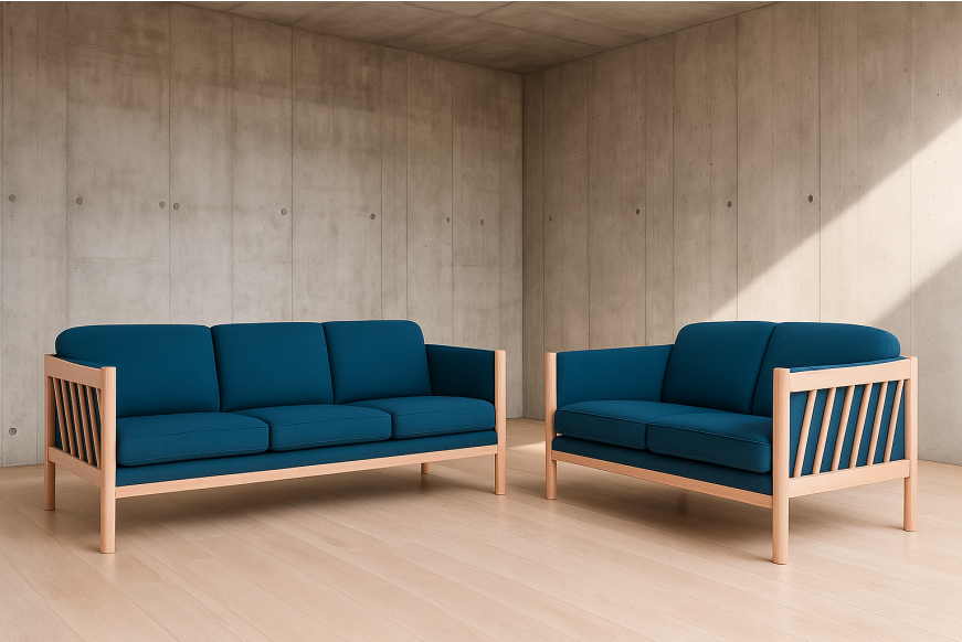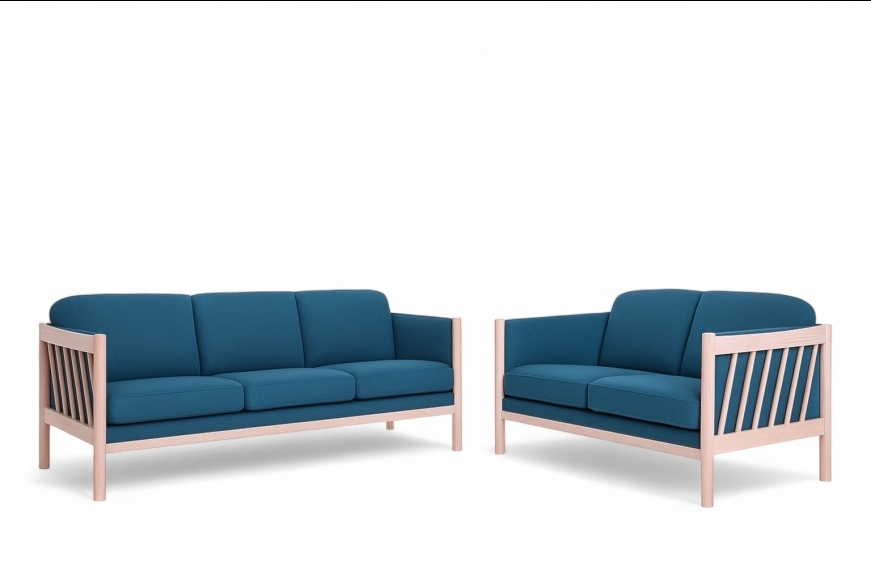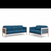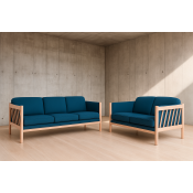 På billedet ses et 2 + 3 prs. Julie sofasæt, samt en Maria stol, med blåt uldbetræk og med ubehandlet bøgetræs stel.