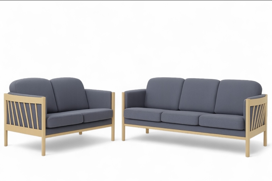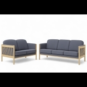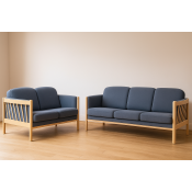 På billedet ses et 2 + 3 prs. Julie sofasæt, samt en Maria stol, med blåt uldbetræk og med ubehandlet bøgetræs stel.