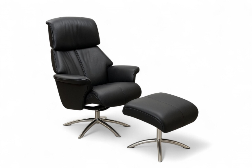 Info: Calibra høj lænestol med justerbar nakkeregulering og tilhørende fodskammel.