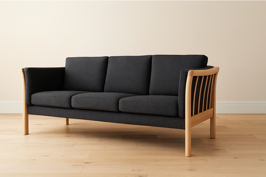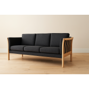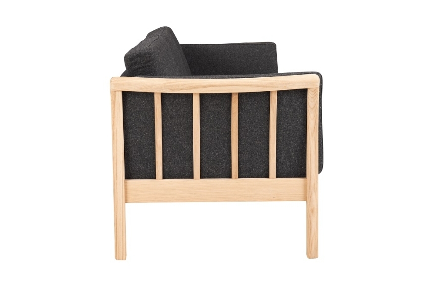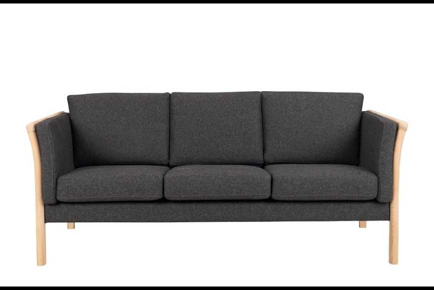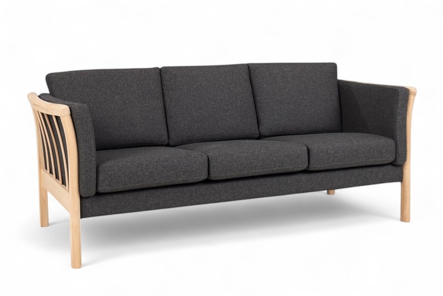 På billedet ses 3 pers. Dorte sofa, med gråt uldbetræk Misha 432-04 og med ubehandlet bøgetræs stel.