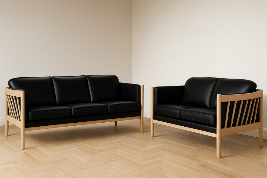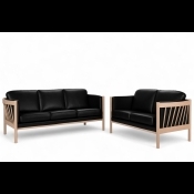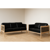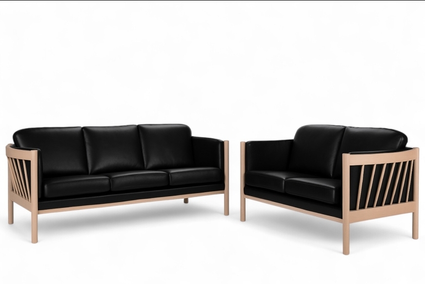 På billedet ses et 3 + 2 prs. Julie sofasæt, med sort læder, massiv bøgetræsstel