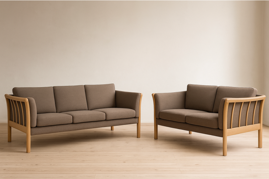 På billedet ses et 3 + 2 prs. Dorte sofasæt, med gråt uldbetræk Misha 432-04 og med bøge lak stel.