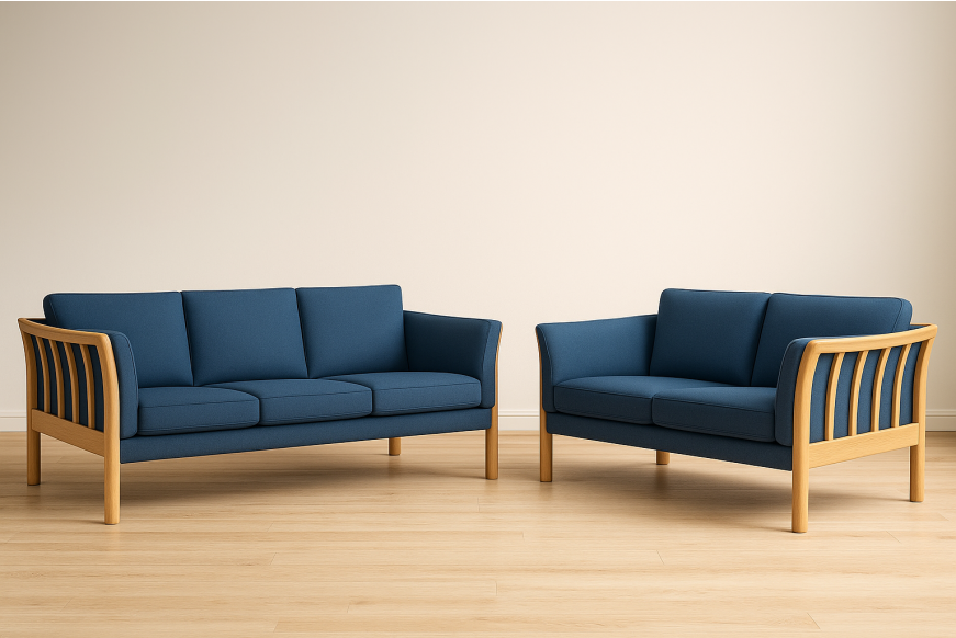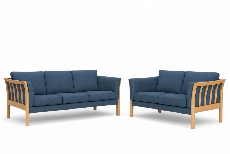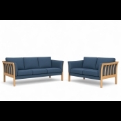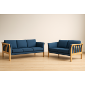 På billedet ses et 3 + 2 prs. Dorte sofasæt, med blå sweet textil og med bøge stel.