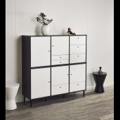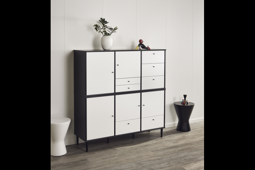 Høj og flot skænk, med masser af plads til opbevaring. 5 låger, 7 skuffer. Sort korpus, ben og sorte greb og hvide låger